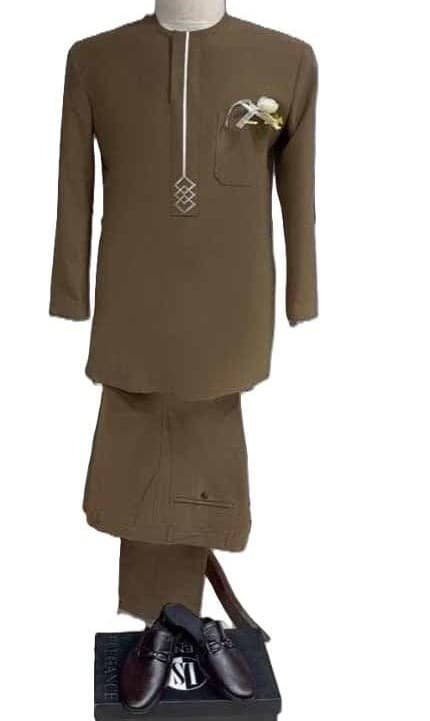 Élégante tenue traditionnelle pour homme, confectionnée avec une coupe moderne et un tissu de qualité supérieure. Sa teinte marron sobre, son col raffiné et ses finitions précises en font un choix parfait pour les grandes occasions ou les sorties chics.